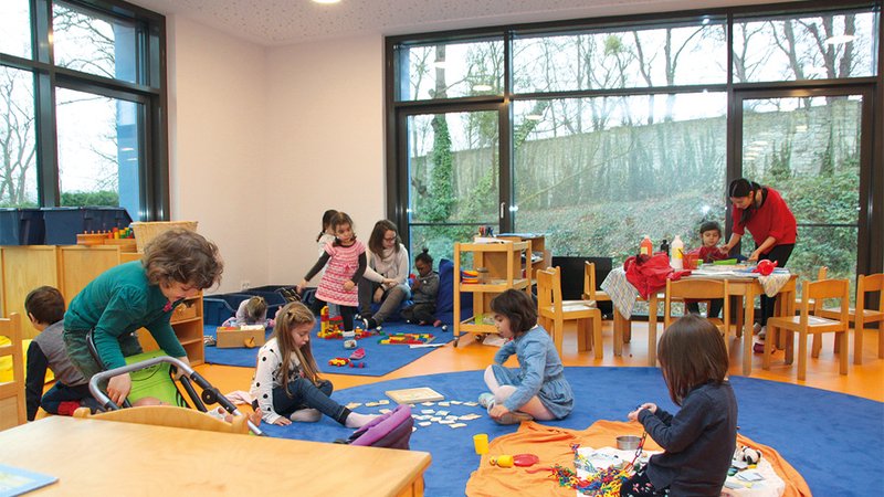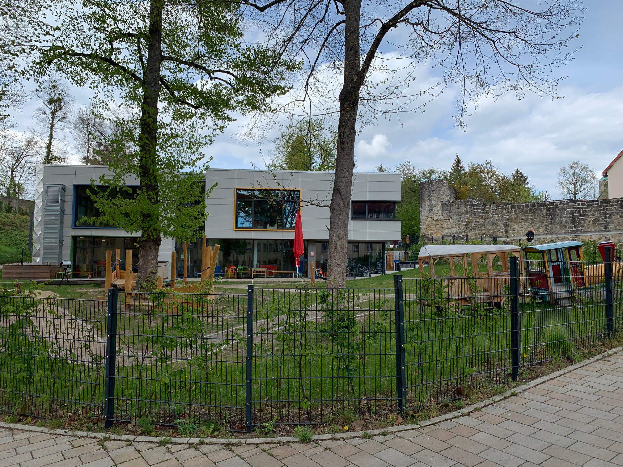 Das Haus mit einer Nutzfläche von 520 m² ist zweigeschossig. Das Erdgeschoss, in dem 15 Krippenkinder betreut werden, bietet einen großen Bewegungsraum mit Blick in den Garten, der auch als Außenspielfläche genutzt wird und direkten Kontakt mit den Bewohnern des gegenüberliegenden Altenheims ermöglicht. Im Obergeschoss sind die beiden Regelkindergartengruppen mit insgesamt bis zu 58 Kindern untergebracht. Das gesamte Gebäude ist barrierefrei, um allen Voraussetzungen gerecht zu werden.